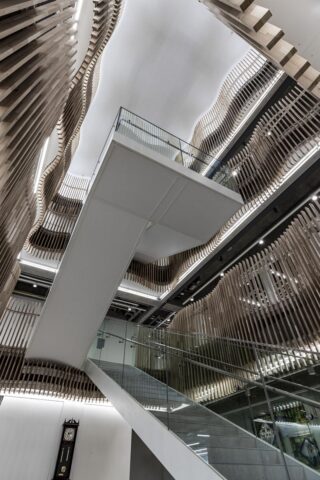 内部は、1階からペントハウスへの吹抜けとなっているセンターホールが、光と気配を通し、杉材の格子に囲まれた階段が上下階をつなぐ。そこに、教室・実習室・図書室などの室が「閉じた箱」ではなく、ひとつながりの学びの風景として立ち現れる。そのなかで講堂は戴帽式など節目の儀式を執り行う看護学校にとっては特別な場所である(戴帽式はナイチンゲールのナースキャップに由来する)。そこに荘内病院と前面広場を取り込み、学びと臨床現場の距離を心象的に近づけた。