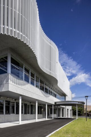 鶴岡市は山形県庄内地域に位置し、庄内藩の歴史と文化が息づく街である。鶴岡市立荘内看護専門学校の新校舎は、「鶴岡の歴史と文化に立脚し、地域医療に貢献する人材を育成する看護学校」をテーマに計画した。文化の息吹溢れる街の一角に静かに佇む。地域医療に貢献しようとする看護を志す人たちの誇りを象徴するように、ナイチンゲールのナースキャップをモチーフとした白いシェイドをあしらった。このシェイドは、室内への日射をコントロールする装置であると同時に、地域に向けて「地域の医療を担ってほしい」というメッセージでもある。